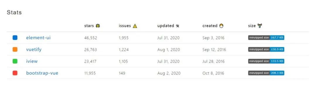 而对于Element的界面设计标准,他的细节设计则更能打动国人。看看这个全世界范围内几大Vue框架的对比,你就知道Element的普及率和使用率了: