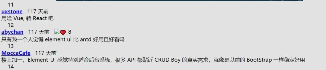 其实我也想换个框架,无奈可选的空间太小,就个人使用体验来说,Element还是感觉最上手,是我最喜欢的UI框架。这可不是我一个人有这样的感觉。。。。看看下面网友对Element的一众打CALL