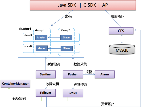 早期,我们主要使用基于Redis客户端集群方案自研的JIMDB来加速业务的访问,主要解决了自动故障检测恢复、自动弹性调度等问题。架构图如下: