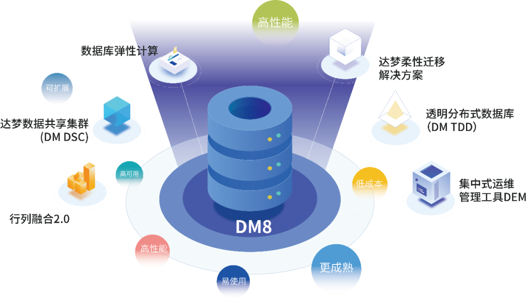 达梦公司发布的新一代自研数据库DM8,推出了数据共享集群、透明分布式数据库、弹性计算、混合事务分析处理等全新数据技术架构,产品改进细节达359项,共通共存满足用户不同场景需求。