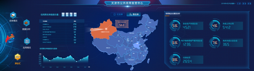 通过综合性的展示大屏,将天津市信用数据的整体情况进行了全景展现,通过各种指标的快速聚合计算,实现了跨多部门数据的联动应用。有效提升了信用相关数据的整合能力,为复杂决策工作提供有力支持。