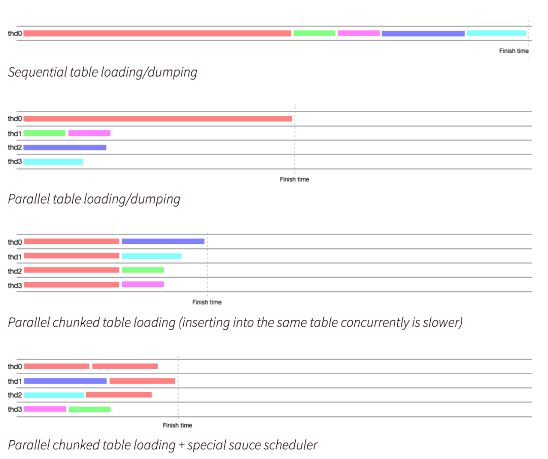 mydumper 也将表分解为较小的块,但是它每一次只加载同一表的块。尽管比在单个线程中加载整个表要快,但这种方法并不能像使用Shell一样扩展,我们通过谨慎地调度块来最大程度地提高摄取率,这将在本文后面的内容中进行解释。