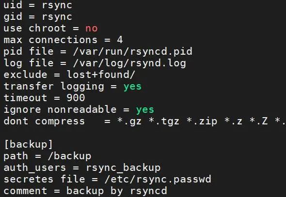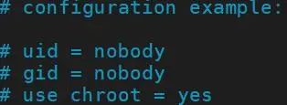 使用vim etc/rsyncd.conf 编辑配置文件,安装好默认配置文件里是没有配置项的,只有一些注释的样例,如下所示: