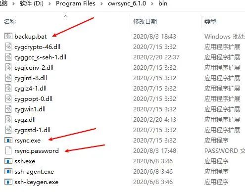 备份主要用的是rsync.exe ,其中backup.bat 和rsync.password 是自己加上去的。