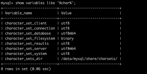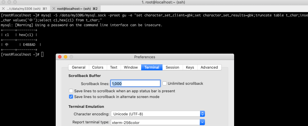 因为terminal为utf8,在shell窗口执行那一串命令时,'中'是以utf8编码的,但又告诉数据库,client端字符集为GBK,那么数据库就把utf8格式的'中',当成GBK格式的'中'做了一次转码,那肯定就转乱套了呀。。character_set_server=utf8,character_set_client=utf8,character_set_results=utf8,terminal(我的iterm工具)的字符集为UTF8。
