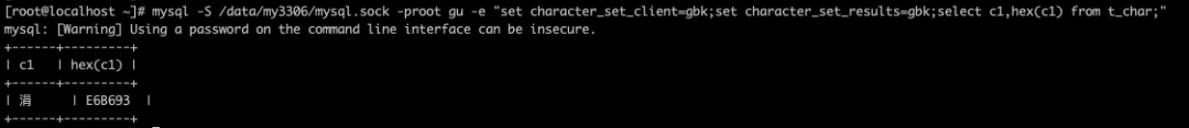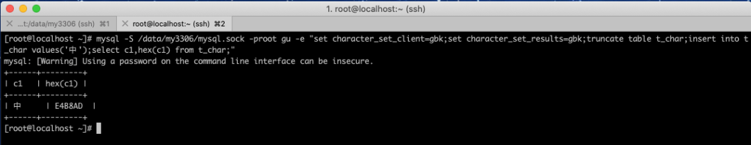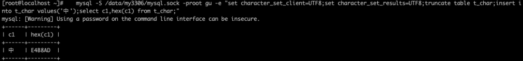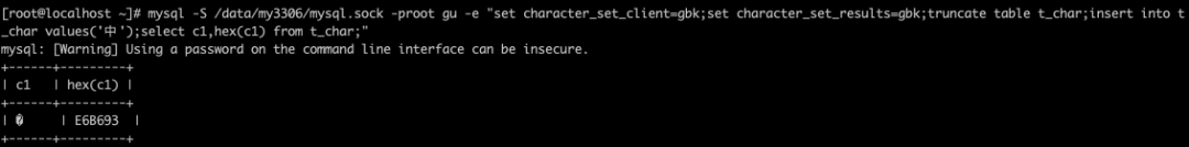 mysql -S data/my3306/mysql.sock -proot gu -e "set character_set_client=gbk;set character_set_results=gbk;truncate table t_char;insert into t_char values('中');select c1,hex(c1) from t_char;"