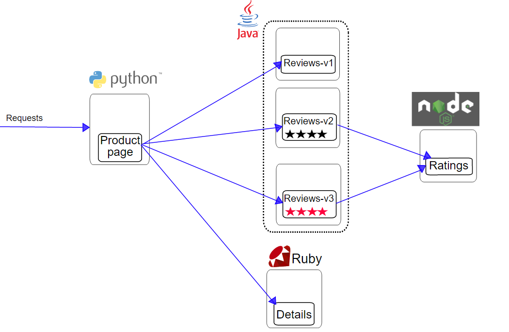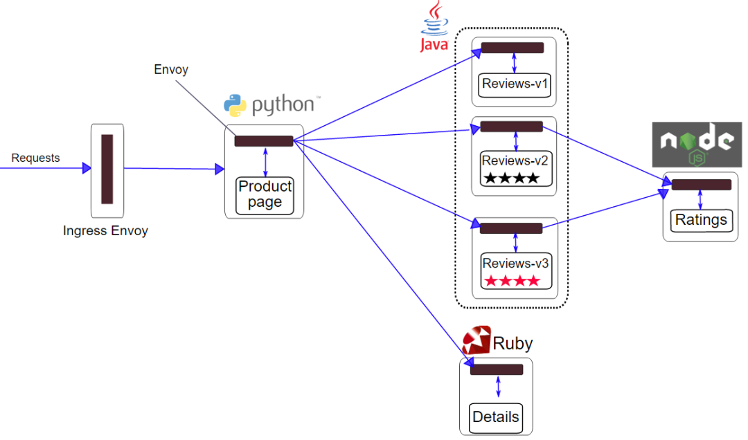 应用上面的原理,我们可以有很多具体的方案应用于日常开发。 模仿在线书店的一个分类,显示一本书的信息。页面上会显示一本书的描述,书籍的细节(ISBN、页数等),以及关于这本书的一些评论。应用的端到端架构:Bookinfo 应用中的几个微服务是由不同的语言编写的。这些服务对 Istio 并无依赖,但是构成了一个有代表性的服务网格的例子:它由多个服务、多个语言构成,并且 reviews 服务具有多个版本。