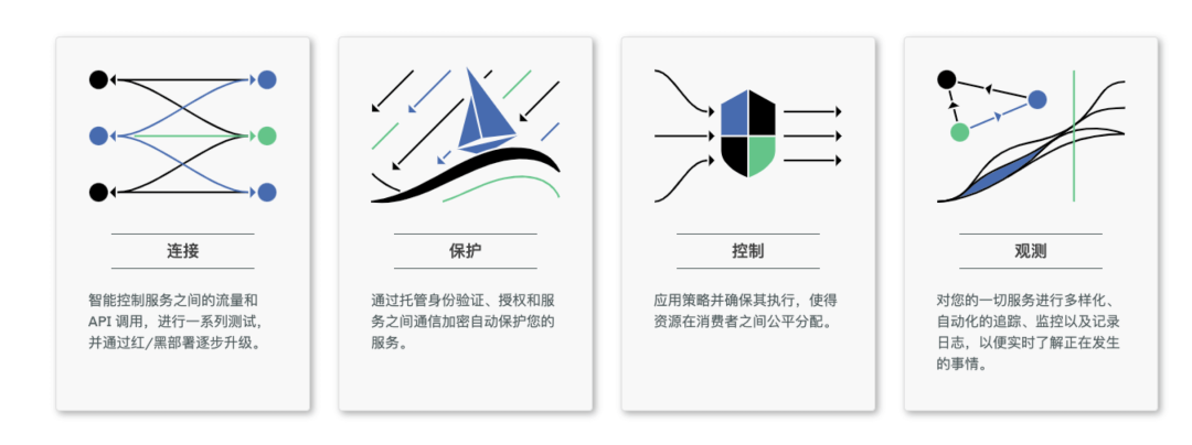 因此,Service Mesh 的代表 Istio 一经推出,就被认为是可以和 Kubernetes 形成双剑合璧效果的微服务管理的利器,受到了业界的推崇。Istio 提供了对整个服务网格的行为洞察和操作控制的能力,以及一个完整的满足微服务应用各种需求的解决方案。Istio 主要采用一种一致的方式来保护、连接和监控微服务,降低了管理微服务部署的复杂性。Istio 发音「意丝帝欧」,重音在意上。官方给出的 Istio 的总结,简单明了: