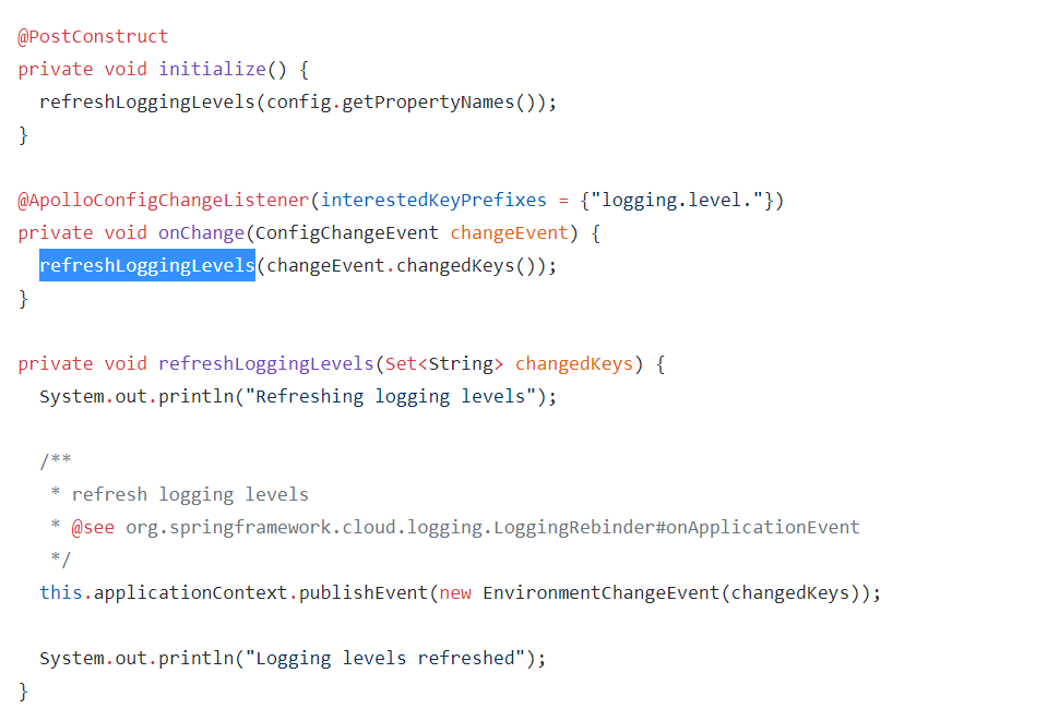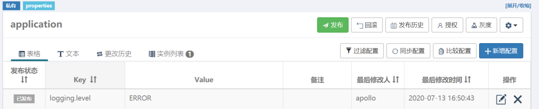 通过Apollo配置中心配置logging.level属性,客户端监听配置变化,根据运维场景需求实时动态调整日志级别。已到达无需频繁修改配置文件、重启应用来修改日志级别。并且对于客户端使用配置属性前台支持可视化查看。