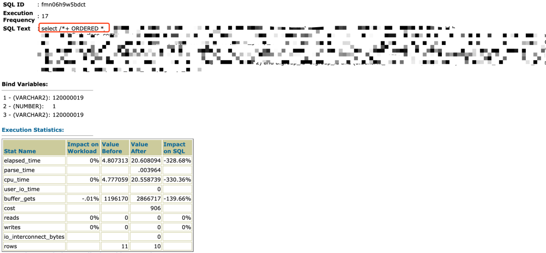 ==》最后只能改写这条语句了,注意到这里使用了hint关键字/*+ORDERED */,该ORDERED提示使Oracle按照表在FROM子句中出现的顺序联接表。怀疑是该hint导致执行计划无法最优。手工把该hint去掉后,测试环境逻辑读降为两千多。