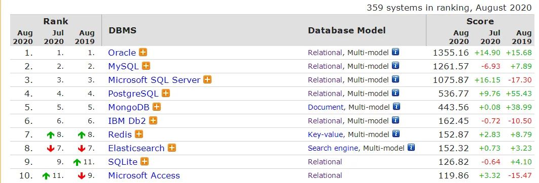 DB-Engines 根据数据库管理系统的受欢迎程度对其进行排名,最近发布了 2020 年 8月份的数据库排名。该网站实时统计了359种数据库的排名指数。前10名的排行情况详见下图: