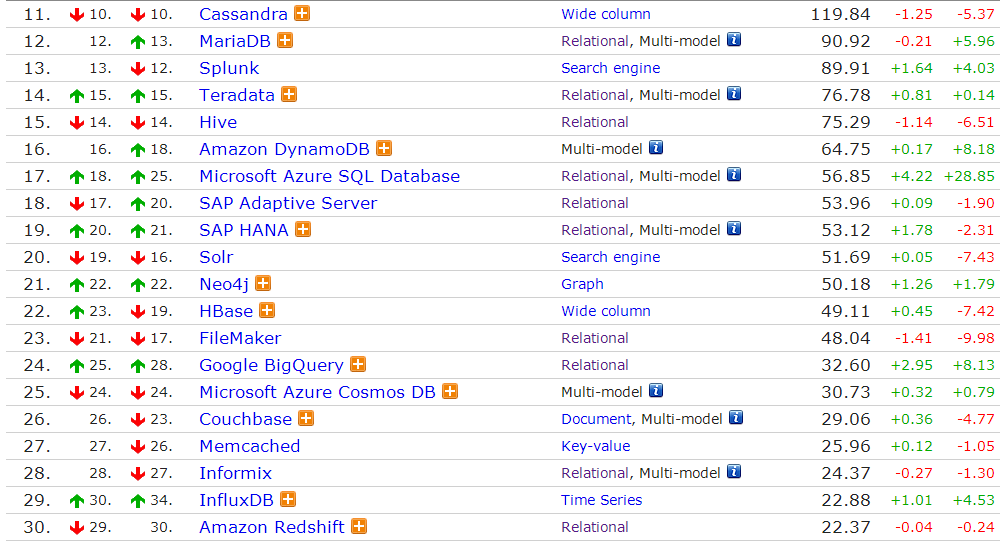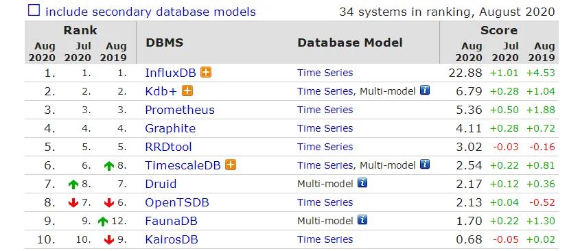 整体涨幅不大,都是一两位的上下浮动,值得注意的是,微软的Azure SQL较去年同期上升了8名,涨了28.85。时序数据库排名第一位的InfluxDB较去年上升了5名,较7月上升了1名。InfluxDB是一款非常优秀的时序数据库,直接推动监控技术进入了实时、纳秒级的新时代。