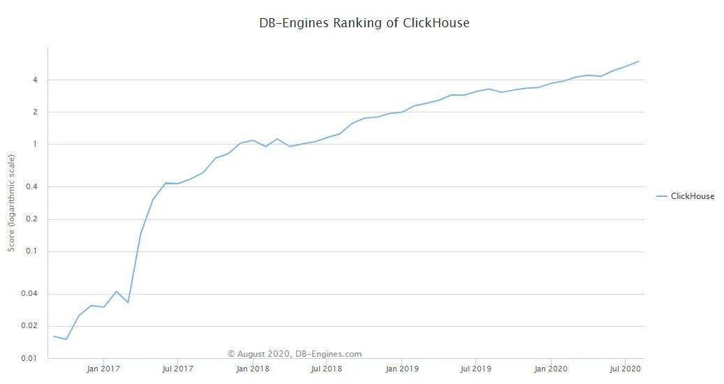 ClickHouse开源时间虽短,但是增势迅猛。自2016年开源以来,ClickHouse一直保持着飞速的发展,是目前业界公认的OLAP数据库黑马,已在头条、阿里、腾讯、新浪、青云等众多公司得以应用。