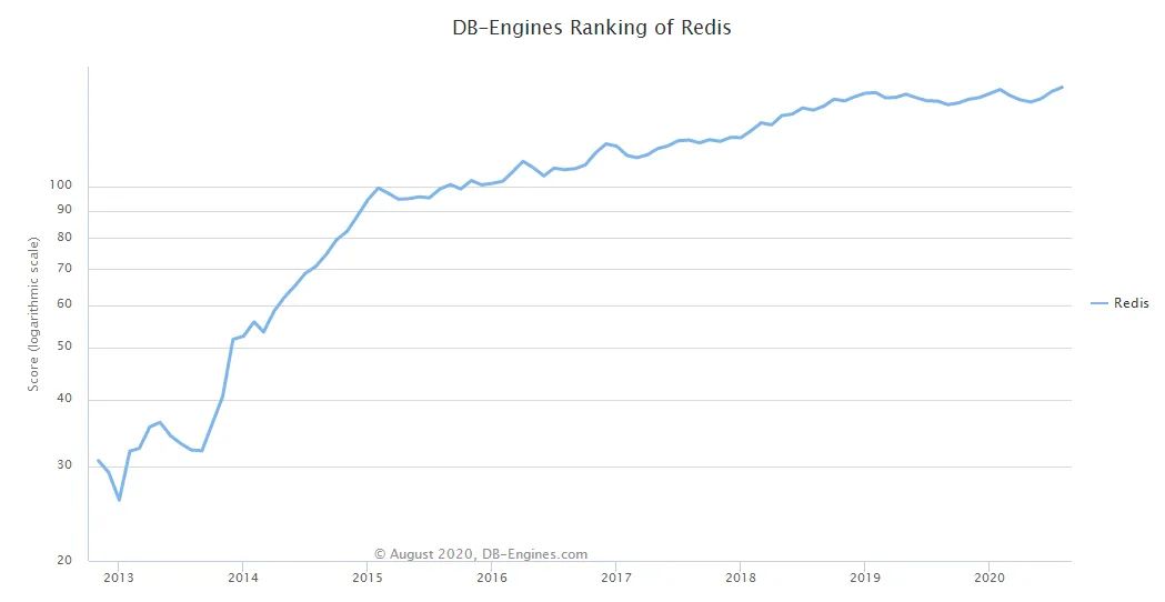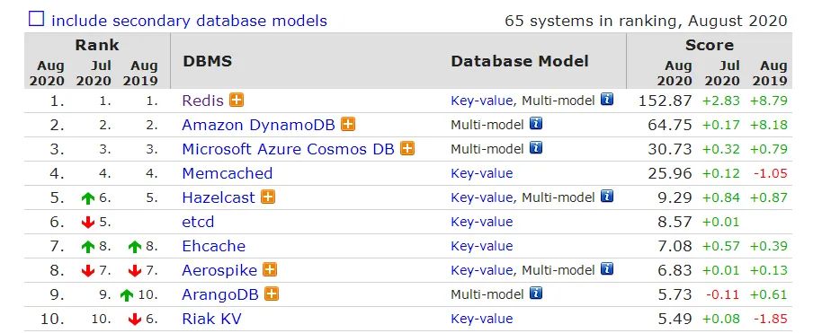抓眼球的红绿对称箭头绝对是最大的看点。Redis终于一甩千年老八的地位,以0.55之差超越了Elasticsearch,,位居第七。较去年同期Redis上涨了8.79,较7月上涨了2.83。虽然涨幅不大,但Redis作为键值数据库的“老大”,逐渐变成了内存数据库的事实标准。