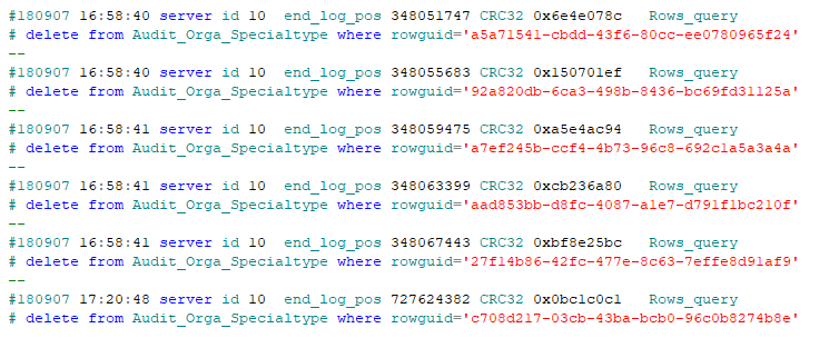 1. 如果不确定 SQL 格式或是无法筛选到数据,比如因为 delete from 中间冷不丁多一个空格出来,可以使用 grep 多次过滤筛选,比如 grep -C 1 -i "Rows_query" |grep -C 1 -i "Audit_Orga_Specialtype" |grep -C 1 -i "delete" 筛选对应表上的 delete 操作。