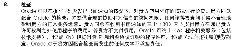 在主协议中,还有一个检查条款,就是说Oracle可以对任何怀疑盗版或超协议使用Oracle数据库许可的用户进行现场调查,条件是只需要提前45天发出通知。对于一些涉密企业来说,这个条款存在一定的安全风险:
