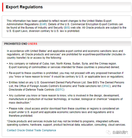 从上述文字可以看出,Oracle GTC要求Oracle许可证必须遵循United StatesExport Administration Regulations (EAR)的要求。Oracle对EAR的遵循如官网所示: