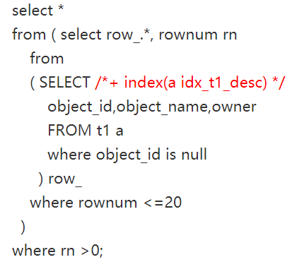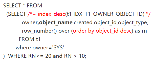 有时如果你需要得到索引降序扫描,而优化器没有选择,这时可以使用index_desc的hint来引导优化器,比如下面这种情况,如: