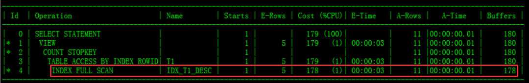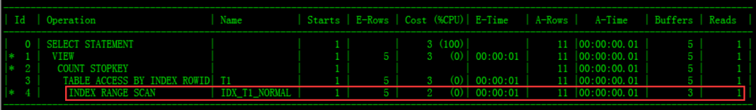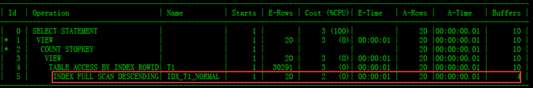 上面SQL,不用加hint,自动使用新建索引, 执行计划使用了index range scan,效率大幅提高,buffer gets只有5: