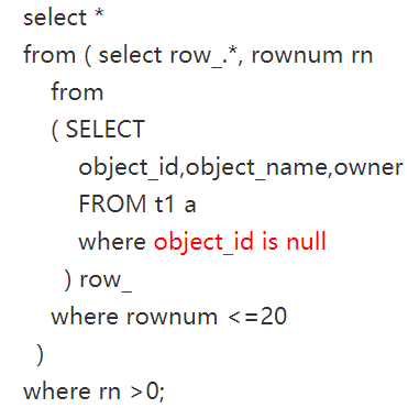 使用的是index full scan , 也要把索引遍历一遍(如果object_id is null的记录数超过20个,null值所在的索引块会先扫描, 因为有rownum<=20,不会遍历整个索引,buffer gets数会大大减少).