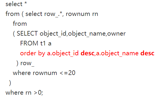 P542:"select t.*,rownum rn from t_tasklog t where rownum<6 order by tasklog_id desc; 单纯从SQL语句来说没有问题,毕竟在进行分页查询时都是这么写的." 上面的sql写法,rownum和order在同一个select层,大部分情况在逻辑上是有问题的,这个逻辑是先随机取5条记录再排序, 而一般的业务逻辑是全部结果集排序再取前5条,需要写两层的select.