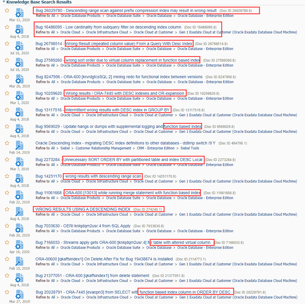 而且降序索引还有一些bug,下面是MOS里面检索descending index bug的结果(截图只是一部分):