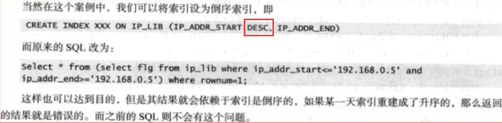 其次,这样的写法如果要建索引,建议创建ip_addr_end+ip_addr_start, 即结束地址在前的普通索引,而不是建开始地址的降序索引;