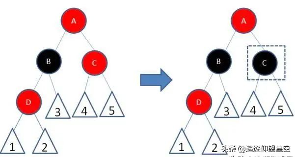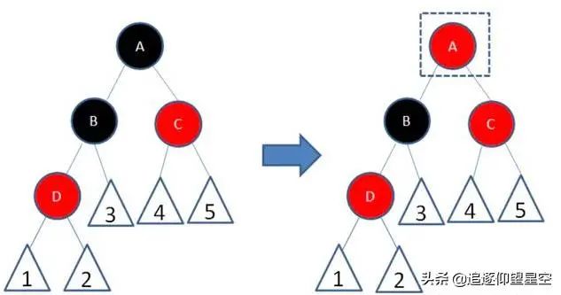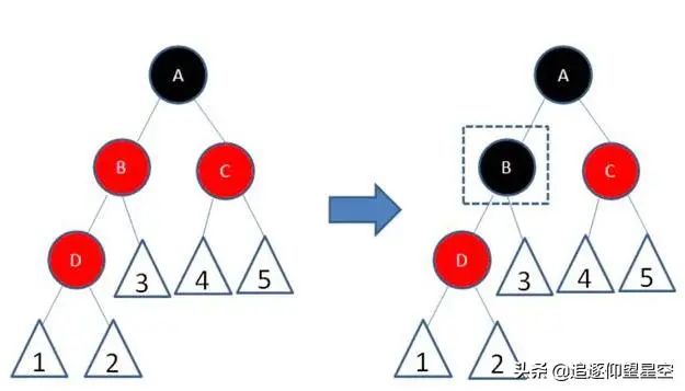从图中可以看出 B 的左节点孩子 也是红色。明显违背了红黑树的概念 (红色节点不可以连续) 那么经过调整后(图中的右侧) 。将 B 节点变为黑色。于是解决了不可以连续的问题。但是又会产生一个新的问题。该侧路径的黑色节点多了一个,导致两边黑色节点不一致。