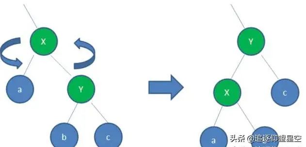 左旋 : 自己的右节点成为自己的夫节点。取而代之的是 右节点的左节点成为了自己的右节点。