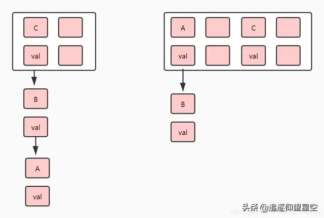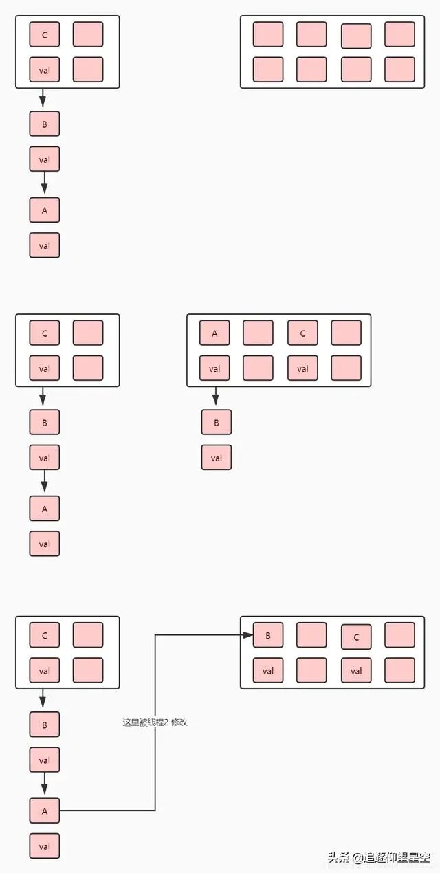 这是一个单线程下扩容。如代码所讲,会将 数组扩容到原来的 2 倍,然后再遍历所有的节点,往新的数组赋值。这个时候有人会说了。为什么 C 跑到其他下标了 A 和 B 还在原来的下标呢?因为 下标是取决了 key 的 hash 和 数组长度的。数组都扩容了那么下标就会导致某种情况下的改动。那是不是每一个Key都会进行一次哈希呢 原则上是这样的,但是在 1.8 后 做出了调整。不会导致去 rehash 因为每次都 hash 会消耗掉很多的性能。