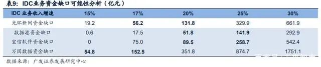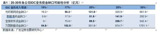 国内公司 IDC 业务年复合增速在 15%-25%之间资金需求较易满足IDC是重资产行业,需要大量资本性支出,若运营资金不足则需要募集资金,我们将对公司未来IDC业务收入能否满足IDC后续扩展的资金需求进行分析。根据对光环新网、数据港、宝信软件、万国数据四家公司2020至2030年IDC建设的资金缺口的测算结果,当光环新网IDC业务收入增速保持在15%-20%,资金缺口为19-132亿元;当数据港IDC业务收入增速保持在20%-25%,资金缺口在52-142亿元左右;当万国数据IDC业务收入增速在15%-17%,资金缺口在55-152.5亿元左右;当宝信软件IDC业务收入增速为20%-25%,IDC业务资金缺口为89.5-258.7亿元,预计宝信软件开发业务未来可以产生经营性现金流114.8-144.7亿元,因此公司资金缺口为0-143.9亿元。我们预估在15%-25%的增速下,IDC公司资金缺口相对较容易满足,预计2020至2030年上述公司的整体年复合增速落在这一区间的概率较大。