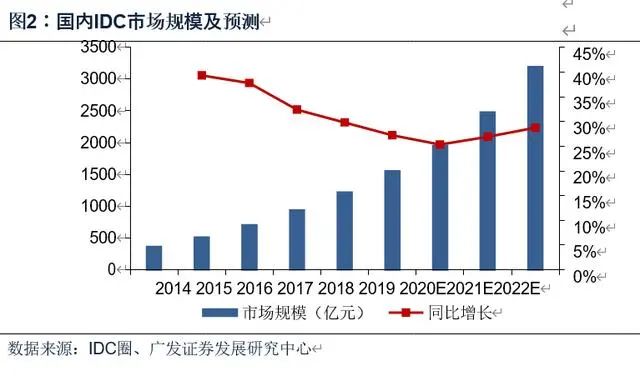 全球IDC市场持续保持高景气度,国内IDC市场规模增速更为突出。2019年国内IDC市场规模达到1,563亿元,同比增速为27.2%。预计2022年,中国IDC市场将迎来大规模增长,市场规模将达到3,200亿元。2018年全球IDC市场规模已达到6,253 亿元,同比增速23.6%。
