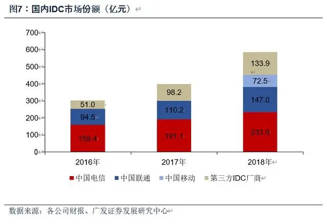 此外,即使能耗指标分散发放到小厂商手里,小厂商在获取云计算等大客户上有难度。头部公司因为有更为稳定的大客户合作关系,可以与有能耗指标的小厂商共同运维IDC。总的来看,头部公司目前由于在融资能力、能耗指标获取以及大客户合作关系具备优势,已构建了行业壁垒。行业竞争格局:专业 IDC 厂商收入增速更快,市场集中度不高当前由电信云运营商主导,第三方 IDC 厂商扩张速度快于运营商根据三大运营商年报,2018年电信、联通、移动的数据中心收入分别是234、147亿元,合计453亿元;主流第三方IDC厂商的收入合计为134亿元(来源为公司财报,不完全统计)。由于国内第三方IDC厂商会同运营商签订合作协议,再通过运营商将数据中心提供给云计算厂商,这部分收入可能在运营商和第三方IDC厂商财报中重复计算。基于我们统计的数据,假设运营商不将这部分计入收入,则整体IDC市场规模是453+134=587亿元,第三方厂商市占率为23%(如果运营商将这部分计入收入,则第三方市占率高于23%)。由于第三方厂商IDC市场规模为不完全统计,实际市占率定高于23%。虽然当前IDC市场主要由运营商主导,但2017年、2018年,主流第三方IDC厂商IDC业务收入规模增速分别为26%、36%,运营商(电信+联通)IDC收入规模增速分别为19%、27%,近两年主流第三方IDC厂商的IDC收入规模增速整体高于运营商。