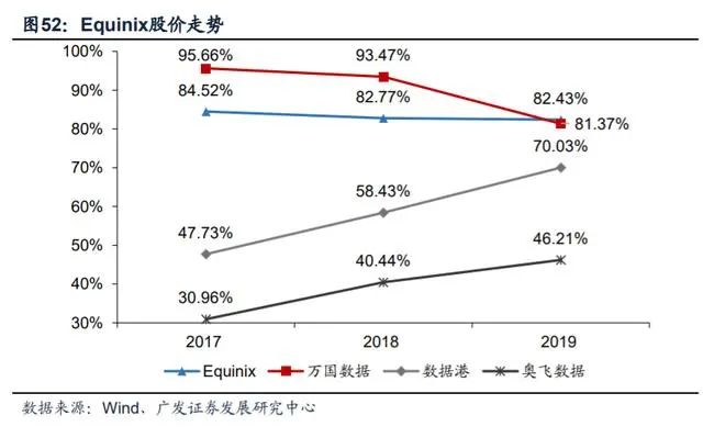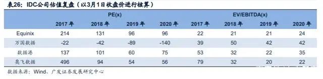 总结:从Equinix单机柜月度经常性收益情况来看,虽然整体持续下降,但降幅不大,2014-2019年仅下降6.6%,数据中心盈利能力较为稳定。随着公司规模不断增加、竞争力不断巩固,Equinix单机柜市值从13-19年是呈上升趋势的。国内业务较纯的IDC公司包括万国数据、数据港、奥飞数据,我们对市场给予三家公司的估值进行了复盘,并与国外IDC龙头Equinix的估值进行对比。由于IDC属于重资产行业,固定资产折旧快速增长将对利润有较大影响,欧美等成熟市场对此类行业大都采用EV/EBITDA进行估值,且不同国家的税收政策存在差异,EV/EBITDA估值方法使得不同国家的公司估值具有一定可比性。按照PE估值来看,Equinix较国内公司高,这可能是由于中美税收政策、公司资本结构和资产折旧摊销存在差异。万国数据和Equinix的息税折旧摊销占EBITDA比重在80%以上,对利润影响较大。因此,EV/EBITDA是更为合理的估值。按EV/EBITDA估值来看,剔除资本结构和各国税收政策差异以及企业在固定资产或其他经营性资产上的会计政策差异的影响后,Equinix估值低于数据港和万国数据,高于奥飞数据。市场给予数据港和万国数据更高估值,这可能是由于万国数据在美股上市无盈利要求,可以快速扩张囤积资源,收入增速较快,而数据港与阿里合作8年,实现深度绑定。