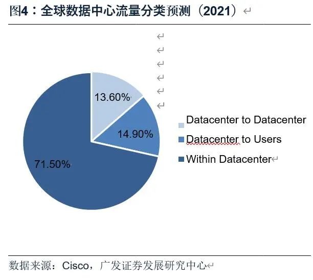 IDC 需求旺盛:长期数据快速增长,短期看云计算厂商持续加大投入从需求端来看,移动互联网接入流量与IDC市场规模呈显著相关,二者相关系数达0.92(置信度:对应P值为0.0002)。数据中心是互联网数据集中汇聚的地方,当前数据流量呈爆发式增长,根据工信部数据,2019年国内移动互联网接入流量达1562.5亿GB。随着5G、物联网等终端应用场景技术的成熟,未来IDC的应用场景将进一步扩大。中短期阿里、腾讯等云计算厂商持续加大资本性开支产生增量需求。短中长期来看,IDC需求向好。根据Cisco发布的《Global Cloud Index 2016-2021》,到2021年全球数据中心流量将达到每年20.6 ZB(1ZB=10243 GB),相较于2016年的每年6.8ZB,增加了3倍左右,2016-2021年的年复合增速高达25%,超七成的流量产生于数据中心内部, 数据中心内部进行海量数据交互,对数据中心网络性能提出挑战。