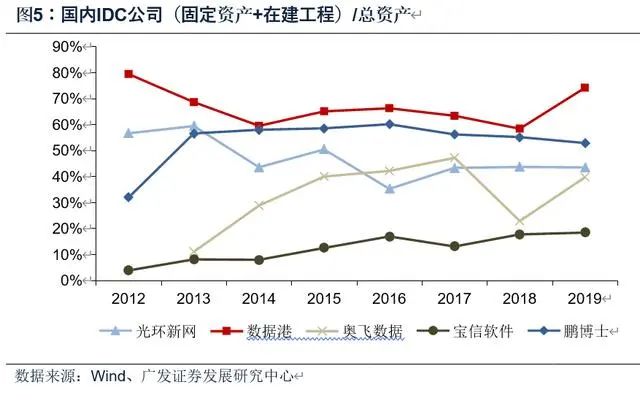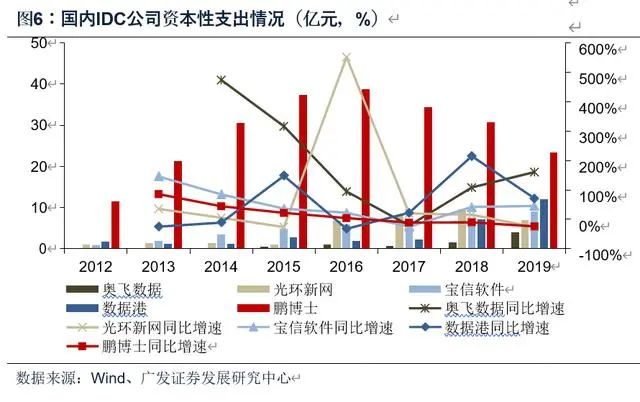 2019年,我国超大型、大型数据中心数量占全球12.7%。这一数据与美国相比仍有较大差距,美国超大型数据中心已占有到全球总量的40%,大型数据中心仍有较大的发展空间,占比会持续提升。2019年国内规划在建数据中心320个,超大型、大型数据中心数量占比达到36.1%,即116个。云计算厂商是数据中心发展的重要驱动因素,云计算厂商持续加大投入,会持续拉动超大型、大型数据中心发展。(数据来源:新浪财经-20年3月15日-赛迪顾问总裁、工业和信息化部运行监测协调局特聘专家孙会峰)。国内云厂商的代表阿里、腾讯未来几年都会有大额投入:阿里:阿里云目前有39个数据中心,相比去年大致同期的32个增加7个(阿里云官网显示)。据新浪新闻2019年4月12日消息,阿里计划宣布未来三年在数据中心方面投资2000亿元,据我们推测其中大致有1000亿元投资于服务器、IDC,19年阿里在此方面的支出约170亿元,基本未来3年投入保持年化40%的增速。腾讯:据5月26日新华网消息,腾讯云与智慧产业事业群总裁汤道生宣布,腾讯未来五年将投入5000亿,用于新基建的进一步布局(涉及云计算、人工智能、区块链、服务器、大型数据中心、超算中心、物联网操作系统、5G网络、音视频通讯、网络安全、量子计算等都将是腾讯重点投入领域)。头部公司已构建壁垒:融资能力、能耗指标获取和大客户合作关系头部公司目前由于在融资能力、能耗指标获取以及大客户合作关系具备优势,已构建了行业壁垒。具备融资能力优势:IDC是重资本投入行业,具有前期投资大、回报周期长的特点, 建设1万个机柜前期大概需要20亿的建设投资,这对公司融资能力提出挑战。目前国内IDC公司处于快速成长期,前期投资较大。头部公司由于已上市,具备持续融资能力,较易满足建设IDC的资金缺口。从数据上来看,国内IDC公司(固定资产+在建工程)占总资产比重大都在40%以上,数据港的比重最高,达到70%以上。其中宝信软件(固定资产+在建工程)占总资产比重在20%以下,这是由于宝信软件并非纯粹的IDC厂商,其业务除了IDC、 IT 运维这类服务外包业务,还包括信息化、自动化、智慧城市这类软件开发业务,因而资产相比其他公司较轻。IDC建设需要大量资本性支出,近几年各大公司的资本性支出整体呈上升状态,可看出各大公司为拓展业务规模,加大IDC部署力度。