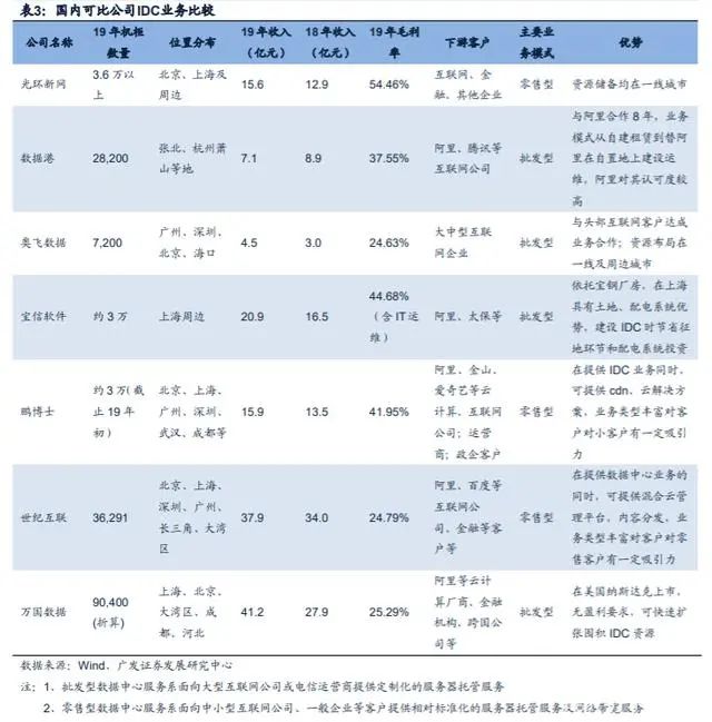 国内IDC厂商的资源都主要分布在一线城市或者经济发达的省会城市,重要客户基本均包括阿里等云计算厂商。光环新网、世纪互联鹏博士、以提供零售型数据中心业务为主(零售型数据中心服务:系面向中小型互联网公司、一般企业等客户提供相对标准化的服务器托管服务及网络带宽服务)。各自特点如下:(1) 光环新网的资源储备均在北京上海地区,IDC资源稀缺性较强。(2) 鹏博士在提供IDC业务同时,可提供sdn、云解决方案,业务类型丰富对客户对小客户有一定吸引力。(3) 世纪互联19年已甩掉CDN,16-18年受CDN业务拖累机柜数量无明显变化, 18年末机柜数量3万个,19年机柜数量快速增长,19年末机柜数量增加至3.6万个。数据港、万国数据、宝信软件主要提供批发型数据中心业务(批发型数据中心服务:系面向大型互联网公司或电信运营商提供定制化的服务器托管服务)。各自特点如下:(1) 数据港与阿里合作9年,业务模式从自建租赁延伸至替阿里在自置地上建设运维,阿里对其认可度较高。(2) 万国数据的优势在于在美股上市,无盈利要求,可快速扩张囤积IDC资源。(3) 宝信软件优势在于依托宝钢厂房,在上海具有土地、配电系统优势,建设IDC时可省去征地环节和配电系统投资。(4) 奥飞数据与头部互联网客户达成业务合作,且资源布局在一线及其周边城市。