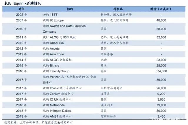 IDC 公司未来仍有望保持较快增长,REITs 开拓融资途径IDC行业兼具重资产和网络效应特性,适宜并购扩张,利于实现资源与客户协同。目前国内IDC行业发展已走过开荒阶段,正迎来激烈的市场竞争,业内各大公司为扩大自身规模,并购动作频繁,其中万国数据扩张速度最快。1.万国数据并购回顾:并购动作频繁,实现业务快速扩张万国数据成立于2000年,是中国领先的数据中心开发商和运营商,数据中心覆盖中国经济核心城市,提供数据中心的设计、建设、运营和托管服务以及IT管理运营外包等服务。公司的主要客户包括大型云服务供应商、互联网公司、金融机构、电信运营商和IT服务供应商等。截止2019年12月31日,万国数据客户规模达到624家。万国数据自2016年在美国纳斯达克上市以来,采取快速扩张战略囤积资源,2019年并购动作相比往年更加频繁,收购了位于北京、廊坊、广州的5个数据中心以及总面积23.47万平方米的土地用以开发数据中心,在2020上半年又收购了位于上海和重庆、总面积共计26.1万平方米的土地。截止2019年12月31日,万国数据运营总机房面积近22.6万平方米(多数土地为租赁模式),按一个机柜占地2.5平方米估算,折合机柜数量约9.04万个。通过并购北上广一线及周边城市数据中心,万国数据实现业务规模快速扩大,近5年收购项目价值合计65.6亿元人民币。Equinix并购回顾:以并购打开亚、欧、南美、中东市场Equinix成立于1998年,2003年在纳斯达克上市,是全球领先的主机托管IBX(International Business Exchange,国际业务交换)数据中心提供商和全球最大的零售型数据中心提供商,主营业务包括主机托管、机柜租赁、互联连接等服务。公司的主要客户为企业、金融机构、运营商、内容供应商以及云IT服务公司,知名客户包括AWS、Azure、HAVI、Google Cloud、verizon、Sysco等。截止2019年末,Equinix在全球的客户规模超过9,700家。回顾全球IDC龙头企业Equinix的发展史,其发展壮大也与它的并购扩张息息相关。Equinix于1998年在华盛顿DC创建首个IBX数据中心,随后通过不断并购扩大业务范围:2002年通过并购i-STT进入亚洲市场;2007年通过收购IX Europe 进入欧洲市场;2011年通过收购数据中心ALOG部分股权进入南美市场,随后在2014年收购了ALOG的剩余股权;2012年通过收购Dubai IBX进入中东市场。近年来Equinix收购动作更加频繁,业务已覆盖全球。截止目前,Equinix的数据中心在美国、德国、英国、澳大利亚等多个国家的市场占有率排名第一,在五大洲、26个国家和55个市场运营了超过210个数据中心。Equinix以并购打开亚洲市场、欧洲市场、南美市场、中东市场,实现业务全球化,近5年期间,Equinix收购项目价值合计63.9亿美元。
