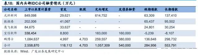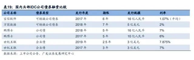 国内IDC公司融资途径主要分为股权融资和债权融资,具体包括公开发行、配股、定向增发、发债券融资、银行贷款等方式。不同融资方式各有优劣:相对债权融资,股权融资募集的资金使用期限长,并且无定期偿付的财务压力,财务风险较小,但会面临股权分散和失去控制权的风险,且融资成本相对债权融资较高;相对股权融资,债权融资虽然股权不会受到影响,融资成本也较低,但要面临定期还本付息的财务压力,融资风险相对更大。一般情况下,企业会兼用这两种融资方式,采用混合融资的方式以缓冲对资本结构的影响。从数据上看,国内头部IDC公司首发上市后,主要的募资途径为定向增发、银行贷款和发行债券,上市以来通过定向增发共累计募集资金106亿元,通过银行贷款共累计募集资金84亿元,通过发行债券共累计募集资金54亿元。配股由于发行对象为原股东,适用范围有限,通过此途径募集资金的IDC公司较少。从融资成本来看,不同公司和不同融资途径存在差异。从融资途径来看,发行可转债的利率较企业债、公司债更低,银行贷款目前利率在6%,介于两者之间。从公司来看,光环新网发行可转债的利率较万国数据低1%左右,鹏博士发行债券的利率较世纪互联低0.9%左右。