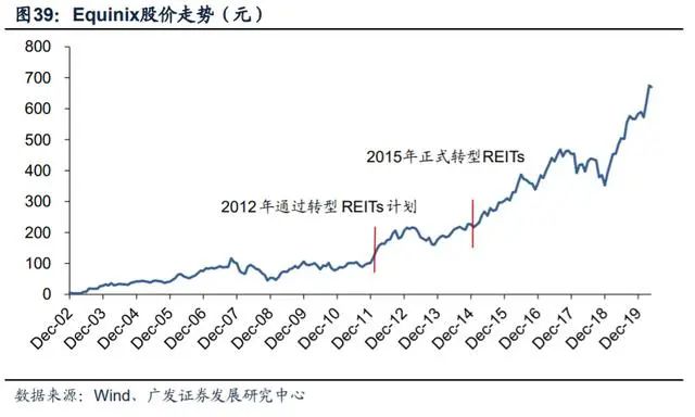 以Equinix为例看转型REITs。Equinix于2012年通过转型REITs的计划,于2014年完成转型REITs,2015年1月1日正式成为REITs,目前已成为全球最大的IDC REITs。优势一:REITs高收益、低风险的特点迎合投资者需求,带来股价高涨。自2012年计划转型REITs以及2015年正式转型REITs后,Equinix的股价均有所上升。一方面REITs具有高收益的特点,收益来自两个部分:一是REITs每年利润派发的股利,美国REITs制度要求REITs将90%的利润派息给股东;二是市场上REITs交易价格的变化,资产增值带来收益。另一方面REITs具有低风险的特点:REITs使得投资者可以以很低的门槛同时投资多个商业物业资产,相比于直接投资商业物业资产,通过REITs投资不动产既降低了投资不动产的门槛,又分散了投资不动产的风险。且REITs产品大多可以在市场上交易,投资者众多,流动性较强,上市REITs产品信息披露制度完善,运营透明度高,这在一定程度上也降低了不动产投资者的风险,对他们来说有着莫大的吸引力。
