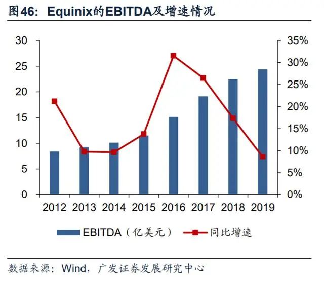 优势三:融资能力提升。Equinix自转型REITs后股价持续高涨,股票发行价格也随之上涨,通过公开发行股票累计募集资金42.9亿美元,通过发行次级债累计募集资金8.4亿美元。从资本性支出来看,自2014年后,Equinix的资本性支出开始快速增长,2013和2014年的资本性支出在6亿美元左右,2018和2019年增至22亿美元。根据纳斯达克官网披露的数据,2020年3月,Equinix的机构股东达到899家,大股东持股比例仅为20%,2019年机构股东有814家,前十大股东持股比例为27%。优势四:资产结构得到优化。Equinix的资产负债率在2015年达到74%,但自2015年转型REITs后融资更容易,在保持快速扩张的情况下也一直稳步下降,在2019年降至63%。资产周转率在2015年后也实现了短暂的提升,但可能由于此后扩张速度加快,周转率又有所下降。自转为REITs后,Equinix开始了大规模并购之路,实现了机柜数量和盈利能力的稳步提升,公司的关键财务指标也得到明显改善:由于转型REITs带来募集渠道的拓宽,使得Equinix的并购计划获得充裕的资金支持,从而实现业务规模拓展。营业收入自2015年实现较大提升,2013-2015年,营业收入复合增速为13%;2015-2018年,营业收入复合增速为23%。EBITDA变化趋势与收入相近,2013-2015年,EBITDA复合增速为11%;2015-2018年,EBITDA复合增速为25%。
