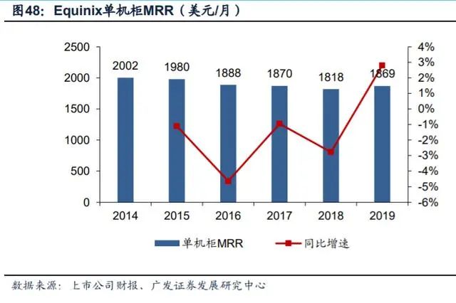 因此,REITs高收益、低风险的特点将对投资者产生较大吸引力,从而带来股价和估值的提升,并优化公司资产结构,降低资产负债率,改善公司融资结构,为公司提供长期稳定的资金,有利于公司业务拓展。但国内目前税收优惠政策尚未落地,公司转型REITs并不能降低税收负担,因此此次REITs试点为国内IDC公司带来的利好将稍打折扣。(一)Equinix MRR 和单机柜市值回溯:趋势下降但降幅不大,IDC 盈利能力稳定Equinix的机柜数量从2013年的11.7万架上升到2019年的29.7万架,2013-2016年的复合增速为19%,2016-2019年的复合增速为15%,机柜数量增加了一倍多。尽管如此,Equinix一直保持着较高的机柜利用率,在近几年一直维持在80%上下。