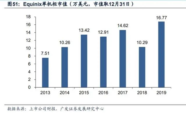 单机柜市值整体呈上涨趋势,在2019年达到最高,近17万美元。单机柜市值与单机柜的盈利能力变动方向不完全一致。整体而言公司在规模不断增加、竞争力不断巩固的情况下,单机柜市值从13-19年是呈上升趋势的。
