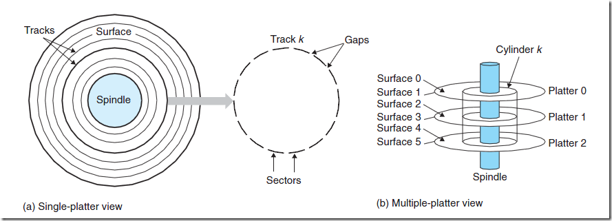 计算机的主存基本都是随机访问存储器(Random-Access Memory,RAM),其分为两类:静态随机访问存储器(SRAM)和动态随机访问存储器(DRAM)。SRAM比DRAM快,但是也贵的多,一般作为CPU的高速缓存,DRAM通常作为内存。这类存储器他们的结构和存储原理比较复杂,基本是使用电信号来保存信息的,不存在机器操作,所以访问速度非常快。他们是易失的,即如果断电,保存DRAM和SRAM保存的信息就会丢失。2.3.2 磁盘存取