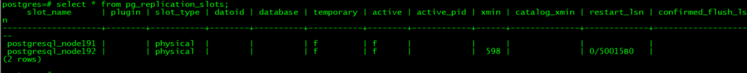 select * frompg_create_physical_replication_slot('postgresql_node191'); select * frompg_create_physical_replication_slot('postgresql_node192'); 创建后查询复制槽 select * from pg_replication_slots;
