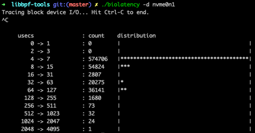 1. 使用 ./biolatency -d nvme0n1 确认 IO 请求的延迟分布情况: