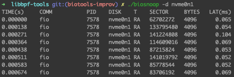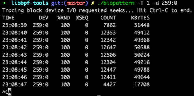 2. 使用 ./biopattern -T 1 -d 259:0 分析 IO 模式: