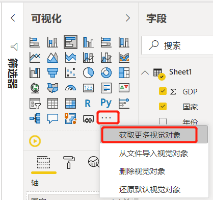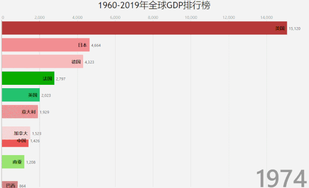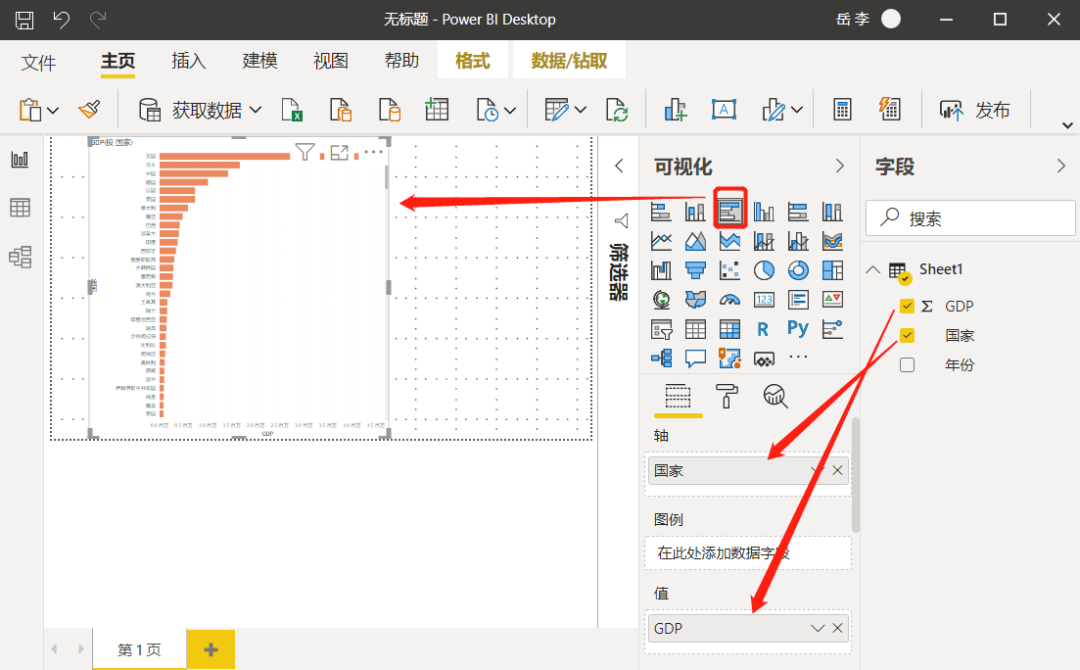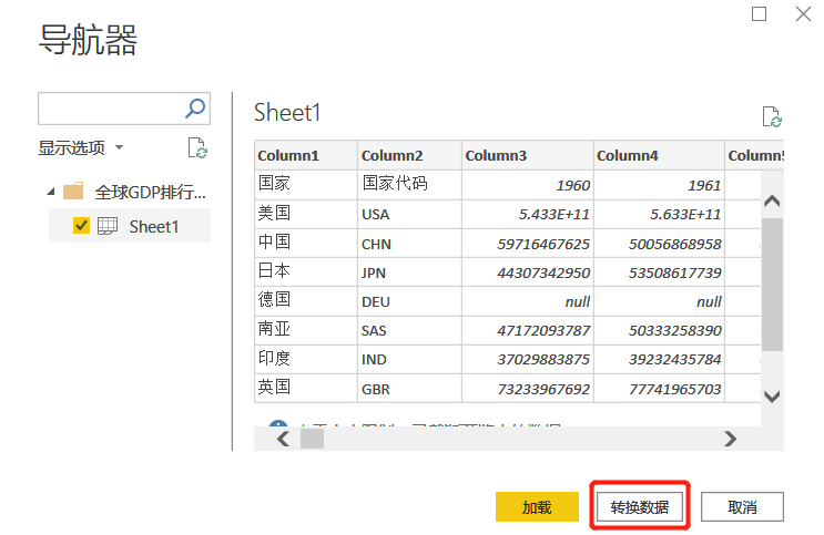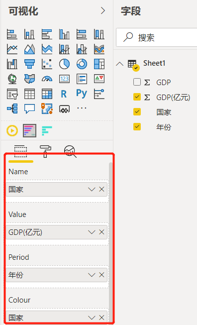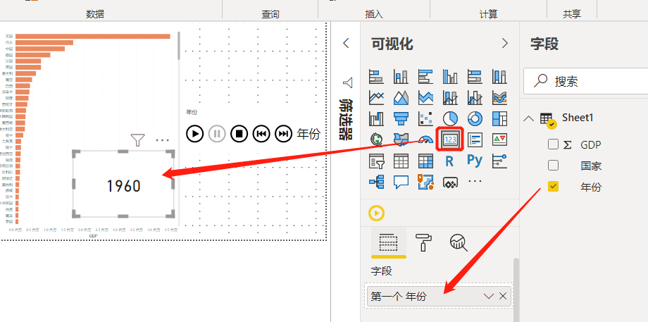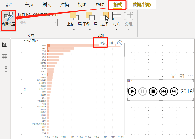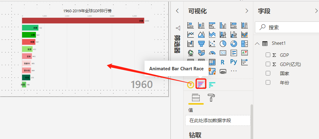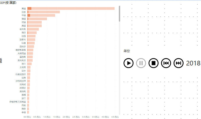有不少小伙伴留言想知道怎么制作的,今天就教大家如何制作这样一个炫酷的动态排行榜。这里我们介绍两种方法,每种方法都有优缺点,但是效果都差不多。要制作这样一份动态排行榜,我们需要知道各个国家2016年到2018年间的GDP才行。我从网上找到了一份这样的数据,在公众号后台回复:GDP 可获取。前两列是国家名称和国家代码,后面就是每一年的GDP值了。有了这份数据,我们打开Power BI,选择从Excel导入数据,如下图:找到这份数据文件,然后在弹出的对话框中选择Sheet1,然后点击【转换数据】按钮这样我们会进入到一个数据处理的界面上。我们在主页的菜单上选择【将第一行作为标题】功能,如下图:国家代码其实我们用不到,如果你不想要它的话,可以选中国家代码这一列,然后选择主页上的【管理】——【删除】即可,当然你也可以右键国家代码列,在弹出的菜单中选择【删除】选项。接下来是比较关键的一步了,我们需要逆透视改表的所有年份,具体操作如下,选择国家列,然后点击菜单栏的【转换】——【逆透视列】——【逆透视其他列】,意思就是逆透视除了国家以外的所有年份的列。当然如果你不嫌麻烦也可以选中所有年份的列,然后点击【逆透视列】。双击属性和值这两列,将它们重命名为年份和GDP。然后将GDP这一列除以100000000(一亿),然后就它转换成整数。调整完之后的数据如下图:这就是我们想要的数据,点击主页的【关闭并应用】即可完成数据整理。然后我们回到主窗口可以看到整理后的数据列。点击中间的【可视化】菜单下的空间,点击控件【簇状条形图】,然后将字段拖放到相应的位置,具体如下图:这样一个大致的轮廓就出了,但是我们发现得到的图是所有年份的汇总数据,而我们想要的是每年动态变化的数据。这里我们就要使用到一个新的控件:轮播控件(Play Axis),在可视化窗口那里可以添加,如下图:在弹出的窗口中我们搜索Play Axis即可找到,然后点击添加即可,如下图:Power BI有非常丰富的控件资源,很多非常炫酷的功能其实都是借助控件来实现的,即使你不会DAX这门脚本语言也可以做出非常精美的可视化效果。添加完轮播控件后我们加载到画布上,然后将年份拖放到相应位置,如下图:年份和排行榜都做好了了,接着要解决它们的联动问题,我们发现点击播放会是下面这个样子:浅色部分是所有GDP的总和,深色部分才是当你的GDP,这与我们想象的不一样啊。那要怎么解决这个问题呢?选中轮播控件(Play Axis),点击菜单栏【格式】——【编辑交互】,会发现可视化窗口的右上角出现了三个小图标,点击最左边的【筛选器】筛选器即可,如下图:这样你再重新点击轮播控件的开始按钮,左表的条形图就会动态变化了。小伙伴们有没有注意到排行榜的右下角会动态显示年份?这里我们添加一个【卡片图】控件到画布上,如下图:这样在轮播控件变化时,卡片图上的年份也会跟着变化。为了将这个图做的好看一点,我们可以对条形图进行格式美化,在可视化控件下面有个调整控件格式的按钮,里面可以调整控件的各种属性,如下图:这里小伙伴们可以自由发挥,下面是我美化后的效果图:这种方法的优点是可以自定义各种数据项,包括柱形图的颜色,标签位置,字体颜色等,可配置性非常强。上面的方法可能会觉得比较复杂,接下来我们再介绍一个视频中的方法,这个是真·超级简单!我们同样需要将原始数据整理成上面的格式:国家,年份,GDP。不同的是我们只需要使用一个控件就可以实现上面的功能,那就是控件:动画条形图(Animated Bar Chart Race)还是在控件市场里面搜索英文名称添加到画布上,如下图:我们调整一下这个控件的几个参数即可开始运行了。具体如下:topN:条形图中的条目数量