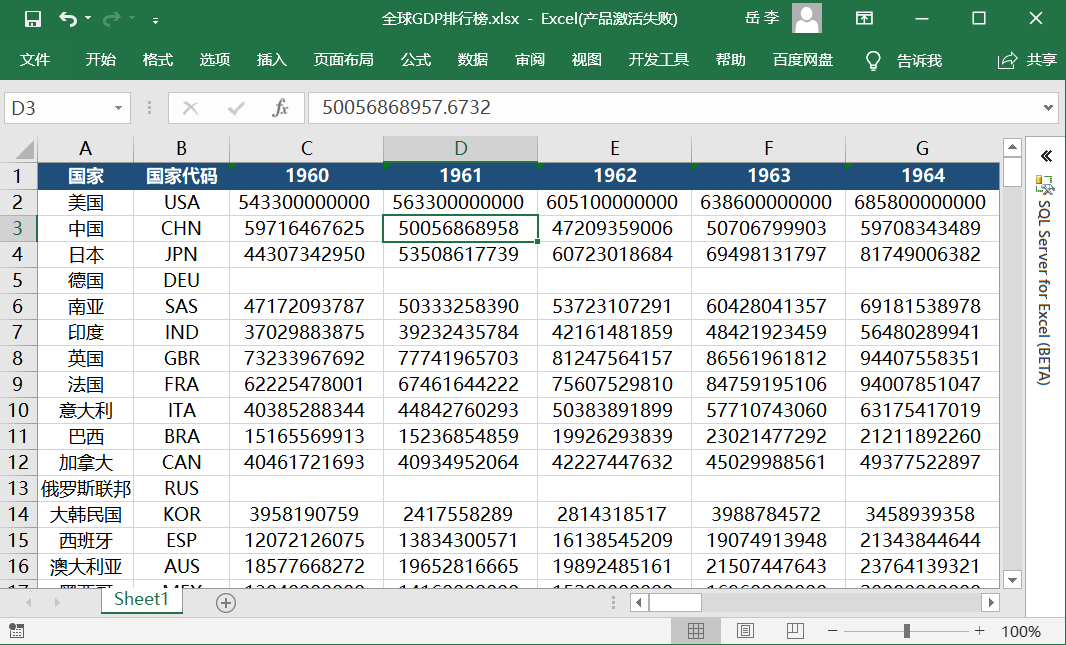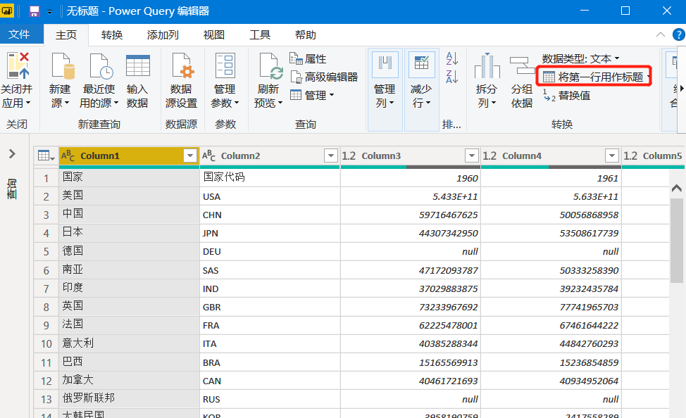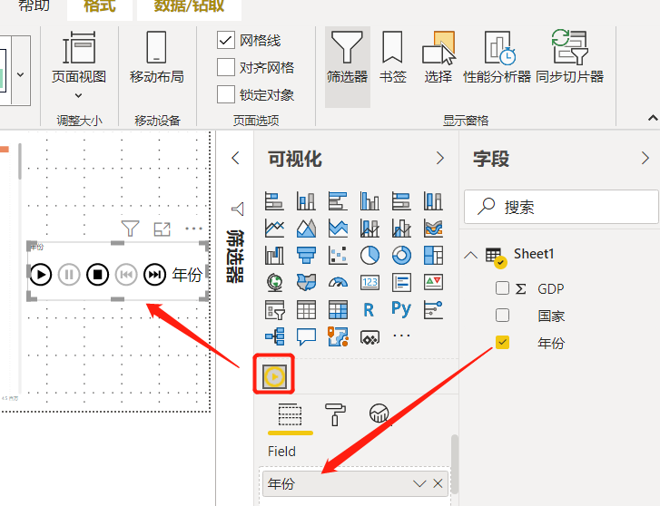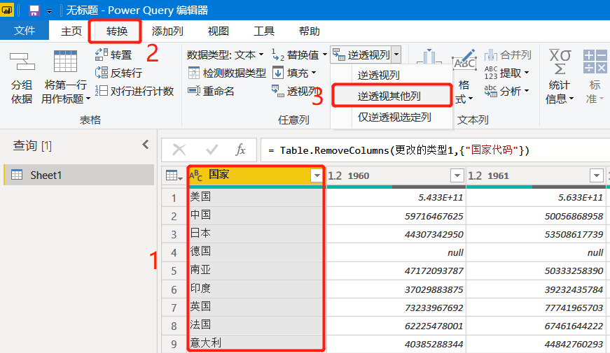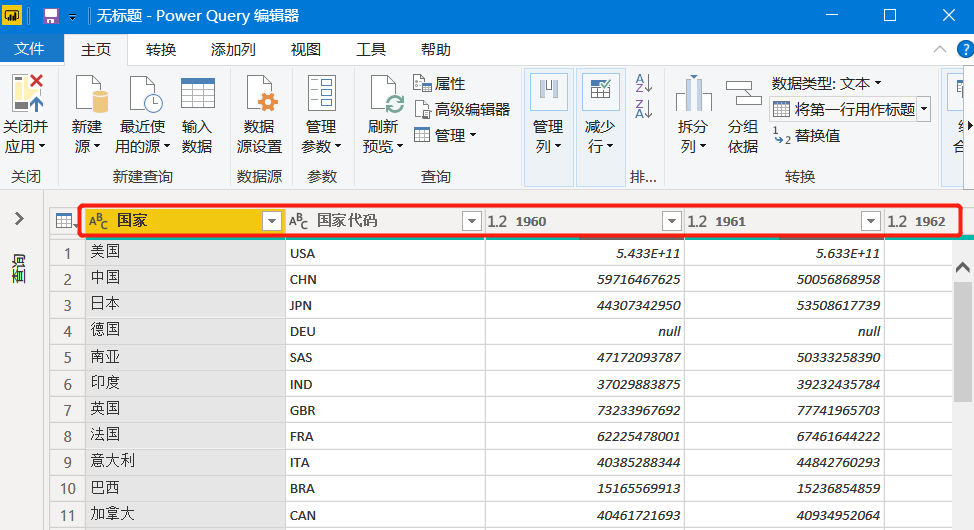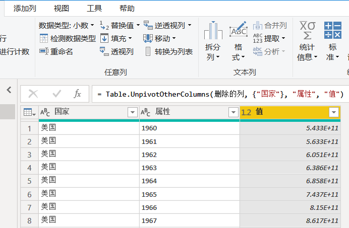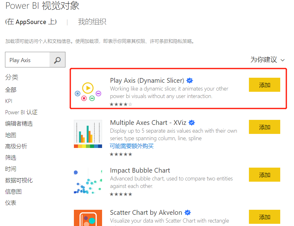 有不少小伙伴留言想知道怎么制作的,今天就教大家如何制作这样一个炫酷的动态排行榜。这里我们介绍两种方法,每种方法都有优缺点,但是效果都差不多。要制作这样一份动态排行榜,我们需要知道各个国家2016年到2018年间的GDP才行。我从网上找到了一份这样的数据,在公众号后台回复:GDP 可获取。前两列是国家名称和国家代码,后面就是每一年的GDP值了。有了这份数据,我们打开Power BI,选择从Excel导入数据,如下图:找到这份数据文件,然后在弹出的对话框中选择Sheet1,然后点击【转换数据】按钮这样我们会进入到一个数据处理的界面上。我们在主页的菜单上选择【将第一行作为标题】功能,如下图:国家代码其实我们用不到,如果你不想要它的话,可以选中国家代码这一列,然后选择主页上的【管理】——【删除】即可,当然你也可以右键国家代码列,在弹出的菜单中选择【删除】选项。接下来是比较关键的一步了,我们需要逆透视改表的所有年份,具体操作如下,选择国家列,然后点击菜单栏的【转换】——【逆透视列】——【逆透视其他列】,意思就是逆透视除了国家以外的所有年份的列。当然如果你不嫌麻烦也可以选中所有年份的列,然后点击【逆透视列】。双击属性和值这两列,将它们重命名为年份和GDP。然后将GDP这一列除以100000000(一亿),然后就它转换成整数。调整完之后的数据如下图:这就是我们想要的数据,点击主页的【关闭并应用】即可完成数据整理。然后我们回到主窗口可以看到整理后的数据列。点击中间的【可视化】菜单下的空间,点击控件【簇状条形图】,然后将字段拖放到相应的位置,具体如下图:这样一个大致的轮廓就出了,但是我们发现得到的图是所有年份的汇总数据,而我们想要的是每年动态变化的数据。这里我们就要使用到一个新的控件:轮播控件(Play Axis),在可视化窗口那里可以添加,如下图:在弹出的窗口中我们搜索Play Axis即可找到,然后点击添加即可,如下图:Power BI有非常丰富的控件资源,很多非常炫酷的功能其实都是借助控件来实现的,即使你不会DAX这门脚本语言也可以做出非常精美的可视化效果。添加完轮播控件后我们加载到画布上,然后将年份拖放到相应位置,如下图:年份和排行榜都做好了了,接着要解决它们的联动问题,我们发现点击播放会是下面这个样子:浅色部分是所有GDP的总和,深色部分才是当你的GDP,这与我们想象的不一样啊。那要怎么解决这个问题呢?选中轮播控件(Play Axis),点击菜单栏【格式】——【编辑交互】,会发现可视化窗口的右上角出现了三个小图标,点击最左边的【筛选器】筛选器即可,如下图:这样你再重新点击轮播控件的开始按钮,左表的条形图就会动态变化了。小伙伴们有没有注意到排行榜的右下角会动态显示年份?这里我们添加一个【卡片图】控件到画布上,如下图:这样在轮播控件变化时,卡片图上的年份也会跟着变化。为了将这个图做的好看一点,我们可以对条形图进行格式美化,在可视化控件下面有个调整控件格式的按钮,里面可以调整控件的各种属性,如下图:这里小伙伴们可以自由发挥,下面是我美化后的效果图:这种方法的优点是可以自定义各种数据项,包括柱形图的颜色,标签位置,字体颜色等,可配置性非常强。上面的方法可能会觉得比较复杂,接下来我们再介绍一个视频中的方法,这个是真·超级简单!我们同样需要将原始数据整理成上面的格式:国家,年份,GDP。不同的是我们只需要使用一个控件就可以实现上面的功能,那就是控件:动画条形图(Animated Bar Chart Race)还是在控件市场里面搜索英文名称添加到画布上,如下图:我们调整一下这个控件的几个参数即可开始运行了。具体如下:topN:条形图中的条目数量