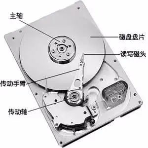 实际运行时,主轴让磁盘盘片转动,然后传动手臂可伸展让读取头在盘片上进行读写操作。